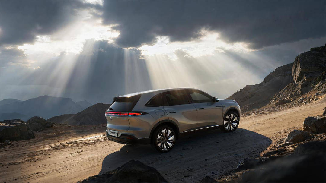 至境E7的命名蕴含深意:“E”取自品牌英文名Electra、进阶Evolution及用户核心Everyone,象征以长期主义为家庭用户提供可持续的出行保障;“7”则代表品牌对大五座SUV市场的精准洞察,谐音“一起”更传递出与用户共赴美好生活的愿景。车身尺寸达4850mm×1910mm×1676mm,轴距2850mm,通过修长的比例与饱满的体量,营造出大气优雅的视觉效果。设计灵感源自至境SUV概念车,飞翼式腰线如海浪涌动,搭配分体式灯组与星河展翼大灯,勾勒出兼具科技感与辨识度的前脸造型。贯穿式银河展翼尾灯采用参数化阵列光源,点亮后如羽翼舒展,20英寸展翼流影轮毂与米其林轮胎的组合,则将空气动力学与美学设计完美融合。