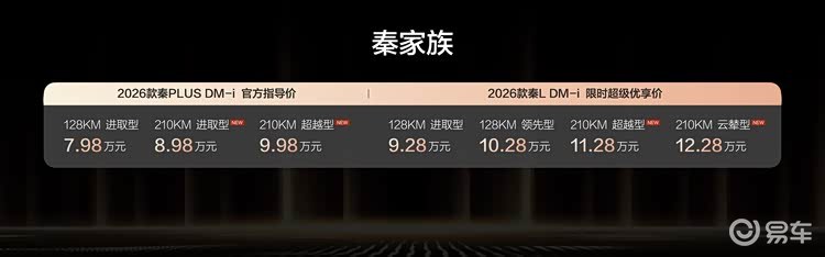 比亚迪秦家族近日迎来两款重磅新车——2026款秦L DM-i与2026款秦PLUS DM-i 210KM长续航版正式上市,定价区间为8.98-12.28万元。此次升级不仅在续航能力上实现突破,更通过豪华科技配置与多重购车权益,重新定义家用轿车的价值标准。两款车型均搭载大容量电池,纯电续航里程达210公里,满油满电综合续航突破2110公里,标志着中级插混轿车正式迈入“200km纯电续航时代”。