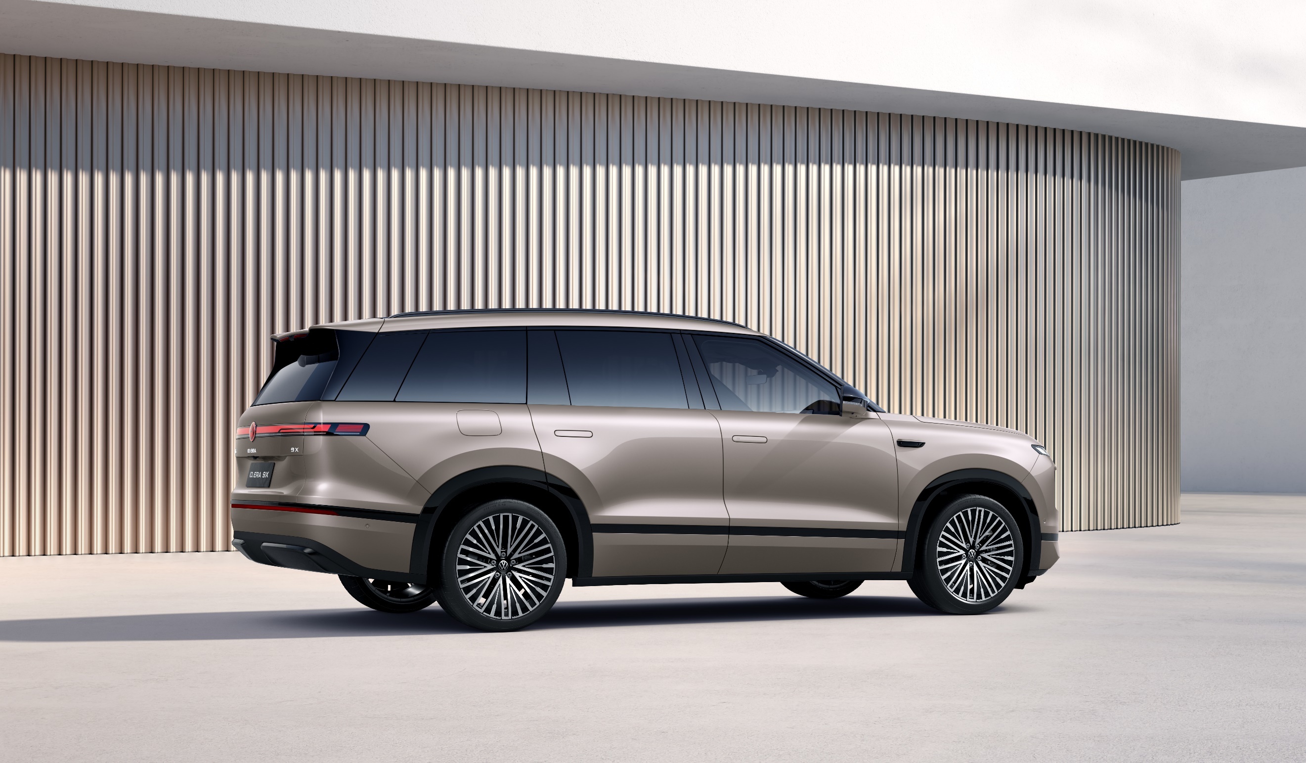 在设计语言上,ID. ERA 9X采用了“大气、纯粹、硬朗”的全新风格,并巧妙融合了东方设计哲学。车身线条流畅简洁,型面饱满连贯,通过三条核心特征线构建出车身骨架,展现出雕塑般的艺术美感。特别是其环宇光翼贯穿式灯带设计,不仅极具科技辨识度,夜间点亮后更显得深邃优雅,令人过目难忘。