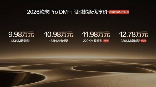 比亚迪近日推出2026款宋Pro DM-i 220km长续航版本,进一步丰富其插混SUV产品线。此次上市的新车包含两款配置,官方指导价区间为12.28万至13.08万元,叠加限时3000元购置税补贴后,实际售价下探至11.98万至12.78万元。至此,该车系已形成133km与220km双续航版本布局,全系在售车型增至四款,价格覆盖9.98万至12.78万元区间。
