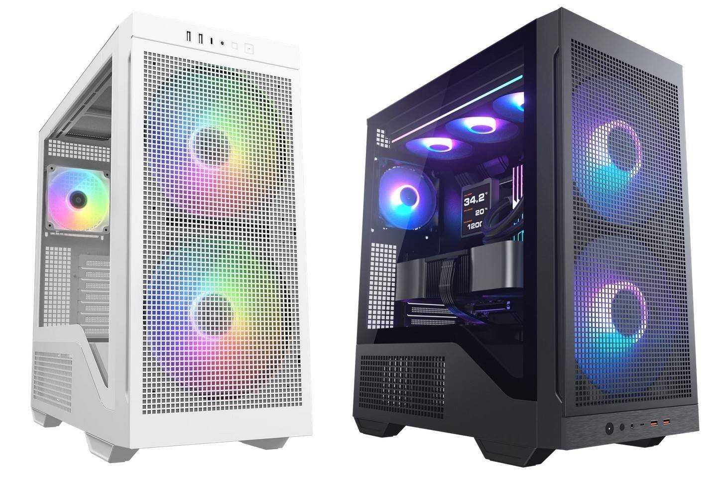 针对不同散热与视觉偏好,DUOAIR机箱推出双版本前板设计:MESH网面版本强化空气流通效率,钢化玻璃版本则突出内部硬件展示效果。其电源仓前移设计释放底部空间,配合底部侧向进气口,为显卡构建独立风道。出厂标配的两把140mm ARGB PWM风扇可兼容长达410mm的显卡,满足主流高性能平台需求。
