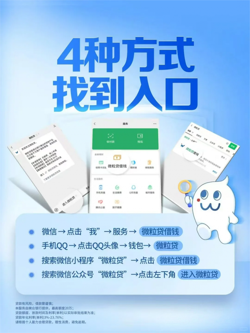 微粒贷开通目前可通过这四种路径:①微信端进入“我-服务”找到入口;②微信搜索“微粒贷借钱”小程序直接使用;③关注官方公众号按指引操作;④手机QQ用户点击左上角头像进入钱包查看。需注意微信与QQ额度共享,一个平台借款后,另一平台额度会相应减少。
