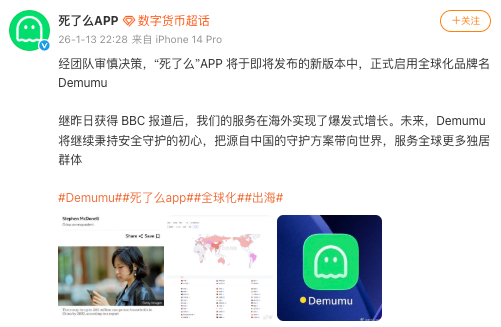 一款名为“死了么”的APP近日宣布,将在即将推出的新版本中正式启用全新全球化品牌名称“Demumu”。这一决定由其开发团队经过慎重考虑后作出,旨在进一步拓展国际市场,提升品牌影响力。