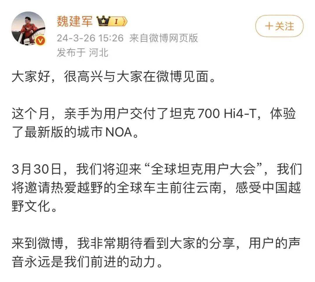 在这股潮流中,魏建军是个例外。他的“出道”与雷军有一定关联。2024年2月底小米SU7发布时,魏建军与雷军互动频繁,互相站台,这一举动让行业颇为惊讶。小米SU7发布会后,魏建军发布首条微博并开启直播,反思过去“光做不说”的策略,从此踏上IP打造之路。