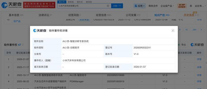近日,国家知识产权信息平台更新数据显示,小米汽车科技有限公司完成了一项重要软件著作权登记。此次获批的软件产品名为“AI小苏-智能诊断专家系统”,登记版本号为V1.0,标志着该企业在智能汽车技术领域取得新进展。