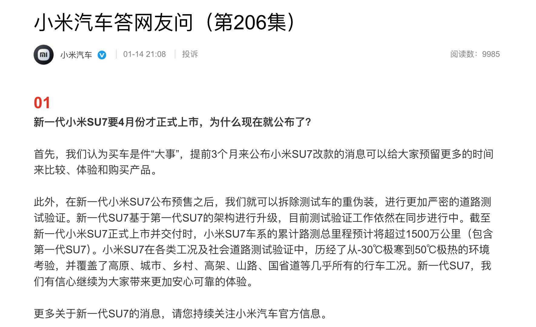 小米汽车近日通过官方渠道回应了网友关于新一代SU7的多个疑问,其中最受关注的是新车上市时间提前公布的原因。官方解释称,汽车消费决策周期较长,提前三个月披露改款信息旨在为消费者预留充足的比较、试驾和购买准备时间。这一策略不仅体现了对用户需求的重视,也为后续市场推广预留了缓冲期。