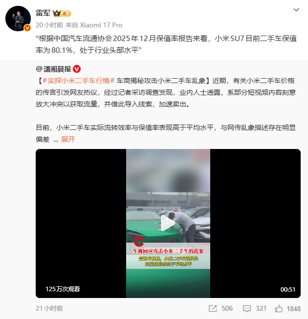针对市场传闻,小米官方迅速作出回应。1月13日,小米科技创始人雷军通过微博辟谣“小米二手车无人问津”的说法,强调相关报道与事实不符。小米公关团队同步转发行业分析文章,呼吁公众理性看待市场波动。值得注意的是,中国汽车流通协会的报告显示,尽管短期价格承压,但小米SU7的保值率仍优于多数同级竞品,其市场认可度未因短期波动出现根本性动摇。