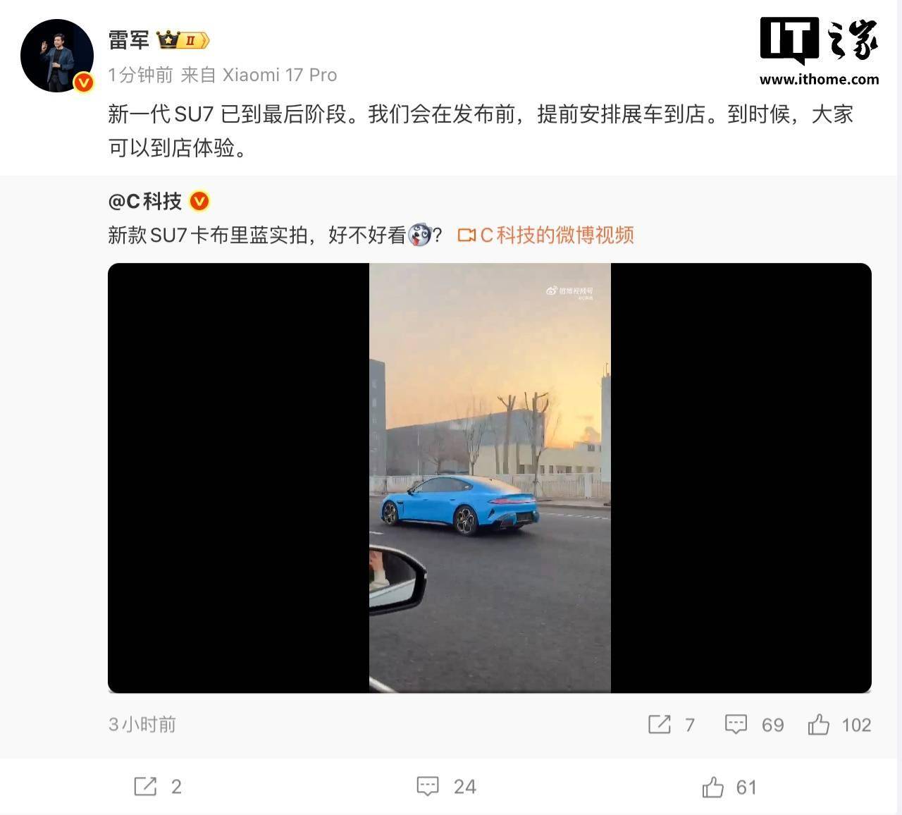 小米集团董事长兼CEO雷军今日通过微博宣布,新一代SU7车型已进入量产前最后准备阶段。为方便消费者提前体验,小米汽车将在正式发布前启动全国展车巡展计划,用户可前往指定门店近距离感受新车魅力。