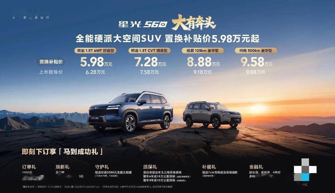 五菱汽车旗下全新中型SUV——星光560正式登陆市场,推出燃油、插混、纯电三大动力版本共四款配置车型,官方指导价区间为6.28万元至9.88万元,置换补贴后售价下探至5.98万元起。作为6万级市场中唯一的中型SUV,新车以越级空间、多元动力选择及高安全标准为核心卖点,重新定义该细分市场的价值标杆。