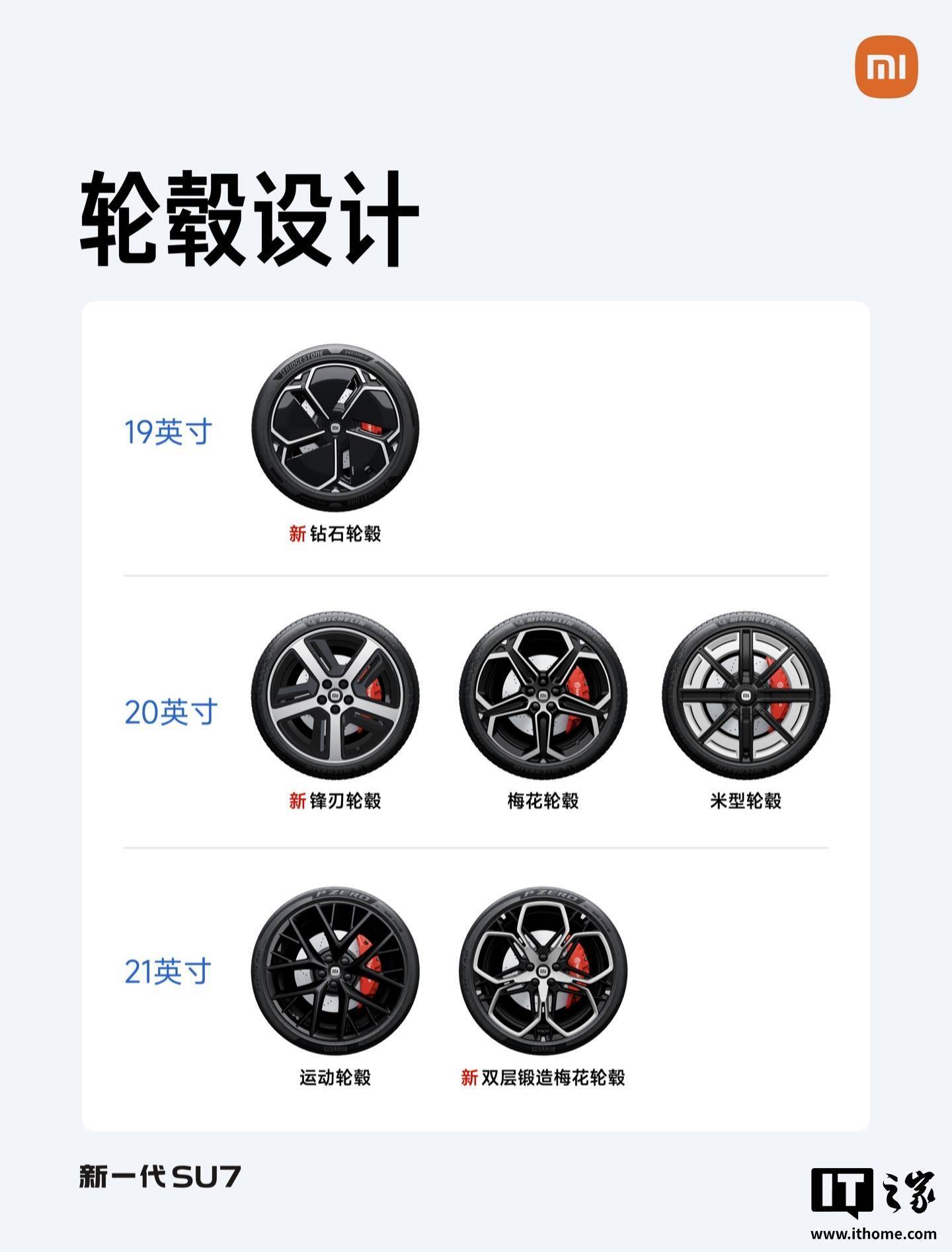 轮毂方面,新一代SU7同样提供了多样化的选择。用户可以根据自己的喜好,从1款19英寸轮毂、3款20英寸轮毂和2款21英寸轮毂中挑选出最适合自己的那一款,为车辆增添一份独特的魅力。