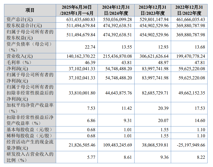 财务数据显示,2022年至2025年上半年期间,公司营业收入呈现波动增长态势,分别为1.99亿元、3.07亿元、2.15亿元和1.4亿元;同期净利润分别为5962.52万元、8399.77万元、5474.85万元和3710.2万元。这种业绩波动主要受风电行业周期性调整及半导体设备研发投入增加等因素影响。