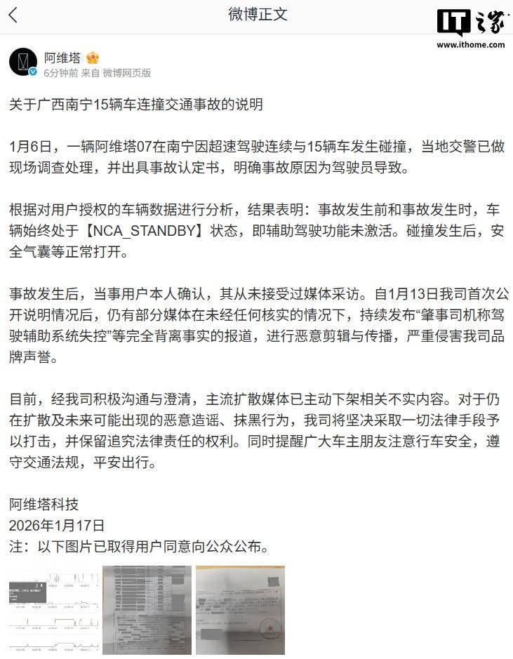 近日,阿维塔汽车就广西南宁发生的一起15车连撞交通事故发布官方说明。据当地交警部门出具的事故认定书显示,1月6日发生在南宁市区的这起严重交通事故,系因涉事阿维塔07车辆驾驶员超速行驶所致。交警现场调查确认,驾驶员操作不当是造成多车连环碰撞的直接原因。
