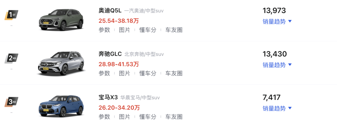 在豪华中型SUV市场,全新Q5L的主要竞争对手仍是宝马X3和奔驰GLC。尺寸方面,三款车轴距均超过2.9米,其中GLC最长并提供7座布局;动力上Q5L以272匹马力领先,百公里加速5.8秒;底盘方面Q5L可选装空气悬架,舒适性和通过性更优;辅助驾驶领域,Q5L成为首款具备城区/高速NOA能力的燃油中型SUV。综合来看,三款车各有侧重:X3强调驾驶质感,GLC注重豪华舒适,Q5L则在动力、智能化和配置下放上表现突出。