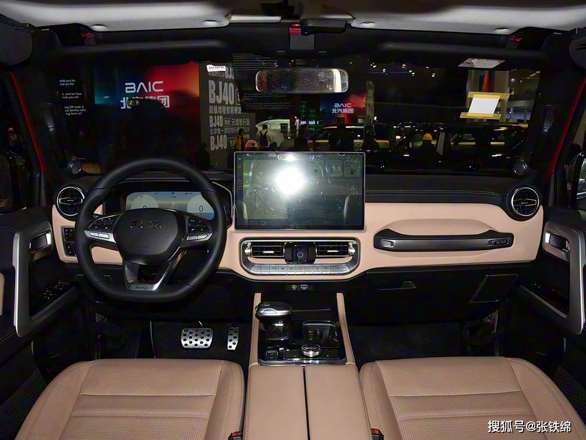 车尾设计同样充满越野元素,上下分体式尾门结构独特,上掀式后风挡与侧开式下尾门组合实用便捷,背挂式备胎强化了硬派形象。尾灯组采用简洁方正造型,内部光源结构经过精心设计,点亮后辨识度极高。内饰升级是本次改款亮点,中控台在保留经典布局的基础上,换装15.6英寸悬浮式超大屏幕,下方空调出风口改为矩形设计,科技感与实用性得到双重提升。