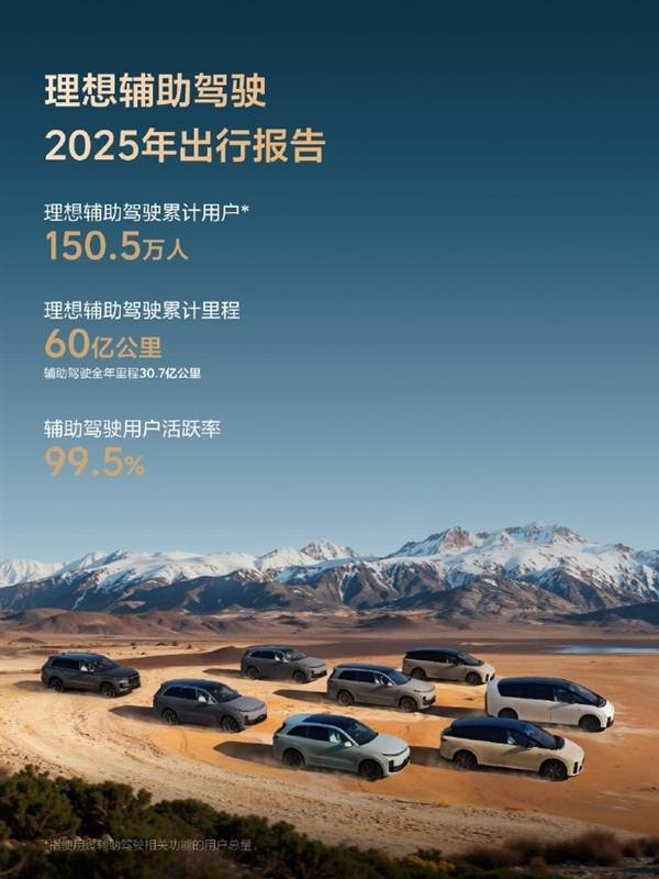 理想汽车近日发布了一份关于其辅助驾驶系统的2025年出行报告,数据显示,该系统累计用户已突破150.5万人,累计行驶里程达到60亿公里,其中全年行驶里程为30.7亿公里。这一成绩标志着理想汽车在智能驾驶领域的持续突破。