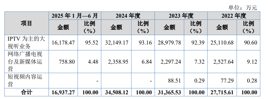 重数传媒的主营业务聚焦于大视听运营领域,以IPTV业务为核心,同时涵盖网络广播电视台业务。公司积极拓展高清超高清应用、线上线下融合应用以及5G物联网人工智能应用等新兴方向,致力于构建多元化的业务体系。在报告期内,即2022年至2025年上半年,重数传媒的财务表现稳健,营业收入逐年增长,分别为2.77亿元、3.14亿元、3.45亿元和1.69亿元;净利润也保持稳定,分别为1.02亿元、1.18亿元、1.19亿元和6795.78万元。