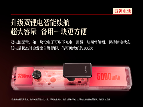 近几年,续航能力已成为用户在选择和使用智能锁过程中的核心焦虑之一。传统单电池设计续航短、充电期间完全断电的痛点,容易让用户在关键时刻陷入“无电可开”的窘境。樱花DZ-D70直击这一根本痛点,升级5000mAh+3200mAh的双锂电池设计,总容量达8200mAh,续航时间远超行业平均水平。当一块电池电量耗尽时,用户可轻松取下充电,而另一块电池即刻无缝接管所有功能,确保门锁7×24小时在线。这不仅实现了智能生活不断电,更重要的是,它提供了一种无需为电量分神、真正从容安心的生活状态,让科技彻底服务于人,隐形于日常,守护于无形。