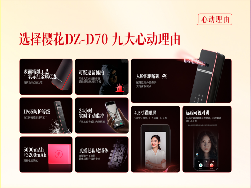 以解决根本痛点的硬实力为内核,以打动情感共鸣的高颜值外显。樱花DZ-D70智能锁成为爆款并非偶然,它精准捕捉了当代家庭对智能安防 “超长续航、极致可靠、美学设计、智慧便捷” 的全面需求。8200mAh双锂电解决了根本性的续航焦虑,IP65防护等级树立了耐用性的新标杆,再加上东方红韵的应景设计与全能智慧体验,共同构成了其难以复制的产品竞争力。