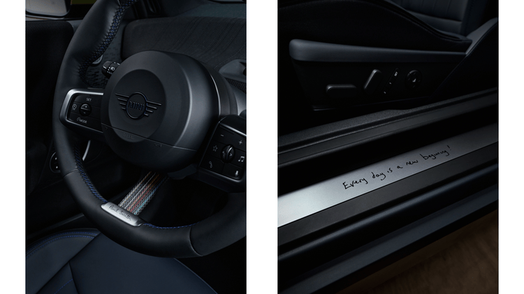 设计师Paul Smith标志性的彩色条纹元素在车身上演"克制美学":驾驶员侧车顶的撞色条纹与方向盘10色编织带形成视觉呼应,仪表台采用立体暗纹织物工艺,在光影流转间展现细腻层次。解锁车辆时,地面投射的手写体"Hello"问候语与脚垫暗藏的手绘幸运兔图案,将英式幽默融入交互细节。迎宾踏板镌刻的"Every day is a new beginning"箴言,配合全车原厂独立编号的签名组件,让每辆车都成为独一无二的艺术载体。