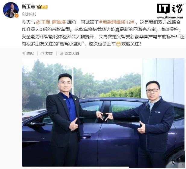 华为智能汽车解决方案BU CEO靳玉志与阿维塔科技董事长王辉共同试驾了新款阿维塔12,这款车是双方战略合作升级至2.0阶段后的首款车型。试驾过程中,靳玉志透露,新款阿维塔12将搭载华为乾崑最新的四激光方案,底盘操控、安全性能以及智能化体验都将迎来显著提升,有望重新定义国产电车在智美新豪华领域的标杆地位。备受关注的“智驾小蓝灯”功能也将首次应用于这款车型。