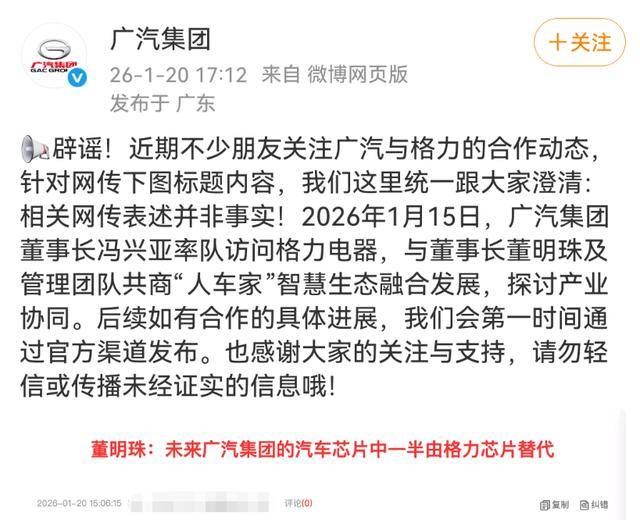 事件起因于1月15日广汽集团董事长冯兴亚率队访问格力电器,格力电器董事长董明珠亲自接待。会面期间,双方围绕“人车家”智慧生态融合发展展开深入探讨,重点聚焦产业协同与智能系统融合方案。尽管会后网络流传董明珠曾表示“广汽未来汽车芯片半数将采用格力产品”,但广汽集团明确指出,相关表述并未在正式交流中出现。