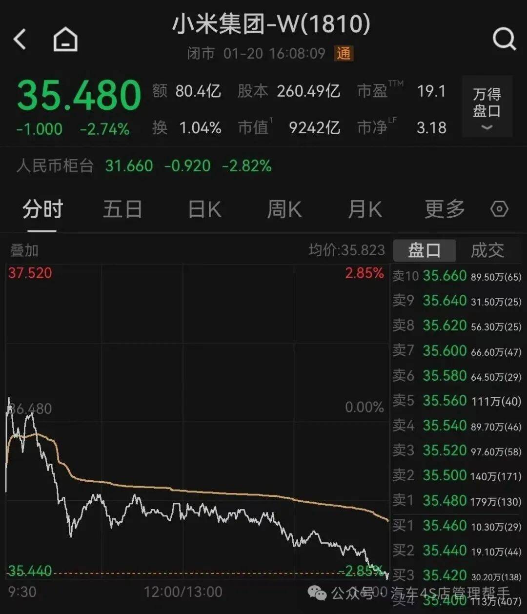 资本市场对这两起事件的反应迅速且剧烈。1月20日港股收盘时,小米集团-W(01810.HK)股价下跌2.74%,报收35.48港元/股,盘中最低触及35.44港元,创下近一年新低。数据显示,自2025年9月下旬近60港元的高点以来,小米股价已累计下跌超40%,市值蒸发规模达5600亿港元,较历史峰值缩水6764亿港元。