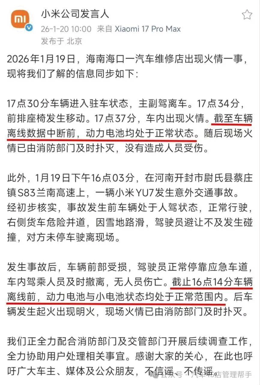 针对两起事件,小米公司发言人于次日通过官方渠道发布声明,强调事故发生前车辆离线数据显示,动力电池与小电池均处于正常工作状态。对于高速事故,公司将其归因于外部碰撞及雪地路滑;维修店火情则披露了详细时间线:车辆于17:30驻车离车,17:34座椅发生移动,17:37火情出现。小米承诺全力配合消防及交管部门调查,并呼吁公众理性看待事件,避免传播未经证实的消息。