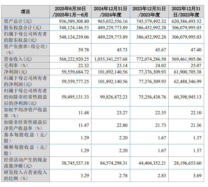 财务数据显示,拓普泰克在2022年至2025年上半年的报告期内保持稳健增长态势。营业收入从5.69亿元逐步攀升至10.35亿元,2025年上半年实现5.68亿元;净利润同步提升,从6190.07万元增长至1.02亿元,2025年上半年达5955.97万元。经营活动产生的现金流净额也呈现持续改善趋势,反映出公司较强的盈利质量和运营效率。