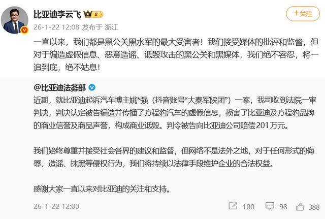 比亚迪高管李云飞也在个人社交平台转发并回应此事。他强调,比亚迪长期以来深受黑公关、黑水军的困扰,是这类不良现象的最大受害者。公司欢迎媒体的批评与监督,但对于那些编造虚假信息、恶意造谣、诋毁攻击的黑公关和黑媒体,比亚迪绝不会姑息迁就,必将一追到底,让违法者付出应有的代价。