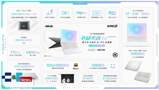 华硕天选Air 2026锐龙AI Max版搭载AMD 锐龙 AI Max+ 392处理器,基于4nm制程及“Zen 5”架构打造,12大核24线程,最高加速频率达5.0GHz。内置RDNA 3.5架构Radeon 8060S集显,具备40个计算单元,图形性能达到现代独立显卡水平,满足生产力、AI、大型游戏等性能需求。