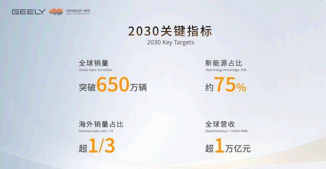 吉利控股集团近日公布了其雄心勃勃的2030战略规划,目标直指全球车企销量前五,并设定了全球年销量突破650万辆、营收超万亿元的宏伟目标。这一战略的发布,标志着吉利在全球汽车市场的竞争中迈出了重要一步。