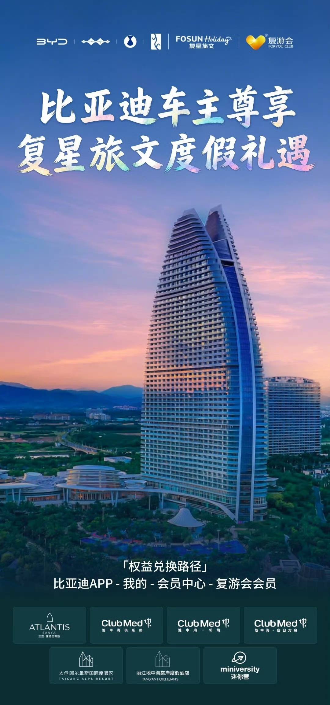 作为合作核心内容,复星旅文旗下高端会员品牌复游会(Foryou Club)的权益已正式接入比亚迪App。比亚迪、方程豹、腾势、仰望等品牌车主可通过手机端一键申领复游会高等级会籍,立即解锁三亚·亚特兰蒂斯、Club Med地中海俱乐部等20余个国际知名度假目的地的专属礼遇。这些权益涵盖住宿优惠、餐饮折扣、亲子活动等多元化服务,形成覆盖出行前中后全场景的增值服务体系。