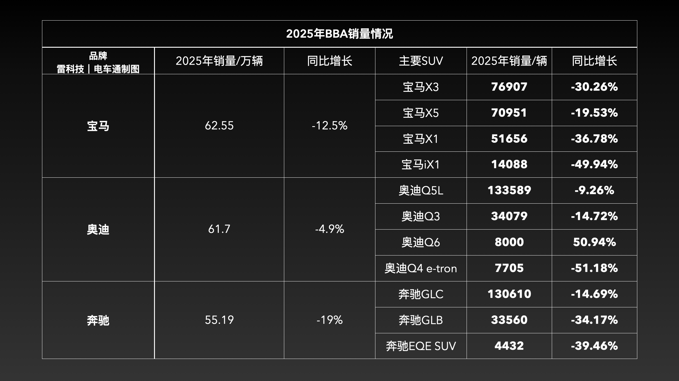 曾经在中国高端SUV市场叱咤风云的BBA(奔驰、宝马、奥迪),如今正面临前所未有的挑战。过去,这些德系豪华品牌年销量轻松突破70万辆,然而去年集体遭遇滑铁卢,其中奔驰年销量跌至55.19万辆,甚至被奥迪反超,昔日辉煌不再。