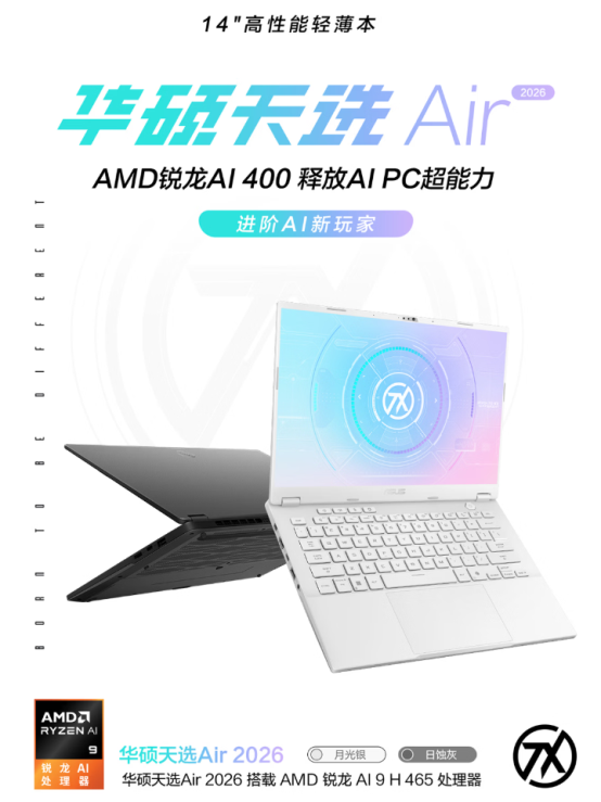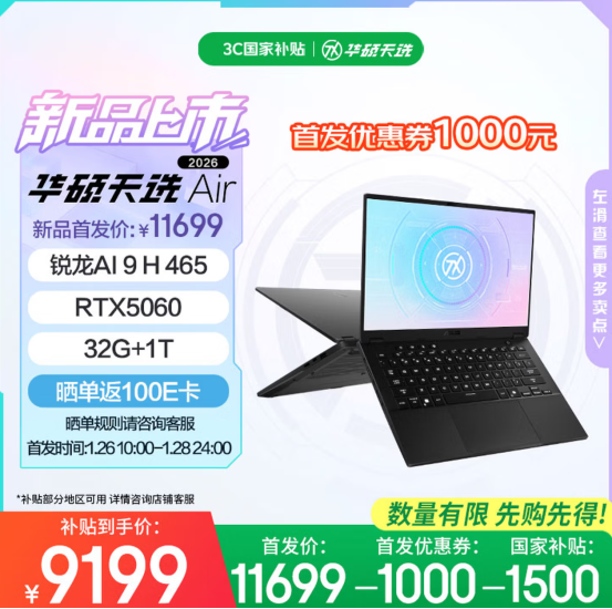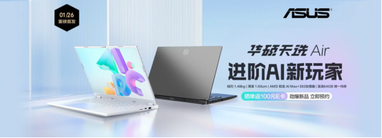 1月26日上午10点,全新14英寸高性能轻薄本华硕天选Air 2026系列全面开售,本次新品包括天选Air 2026锐龙AI Max版与天选Air 2026两个版本。1月26日上午10点至1月28日24点首发活动期间,天选Air 2026系列新品享1000元首发优惠券与1500元国补优惠,最低到手价8499元,晒单还可返100元E卡,切勿错过。