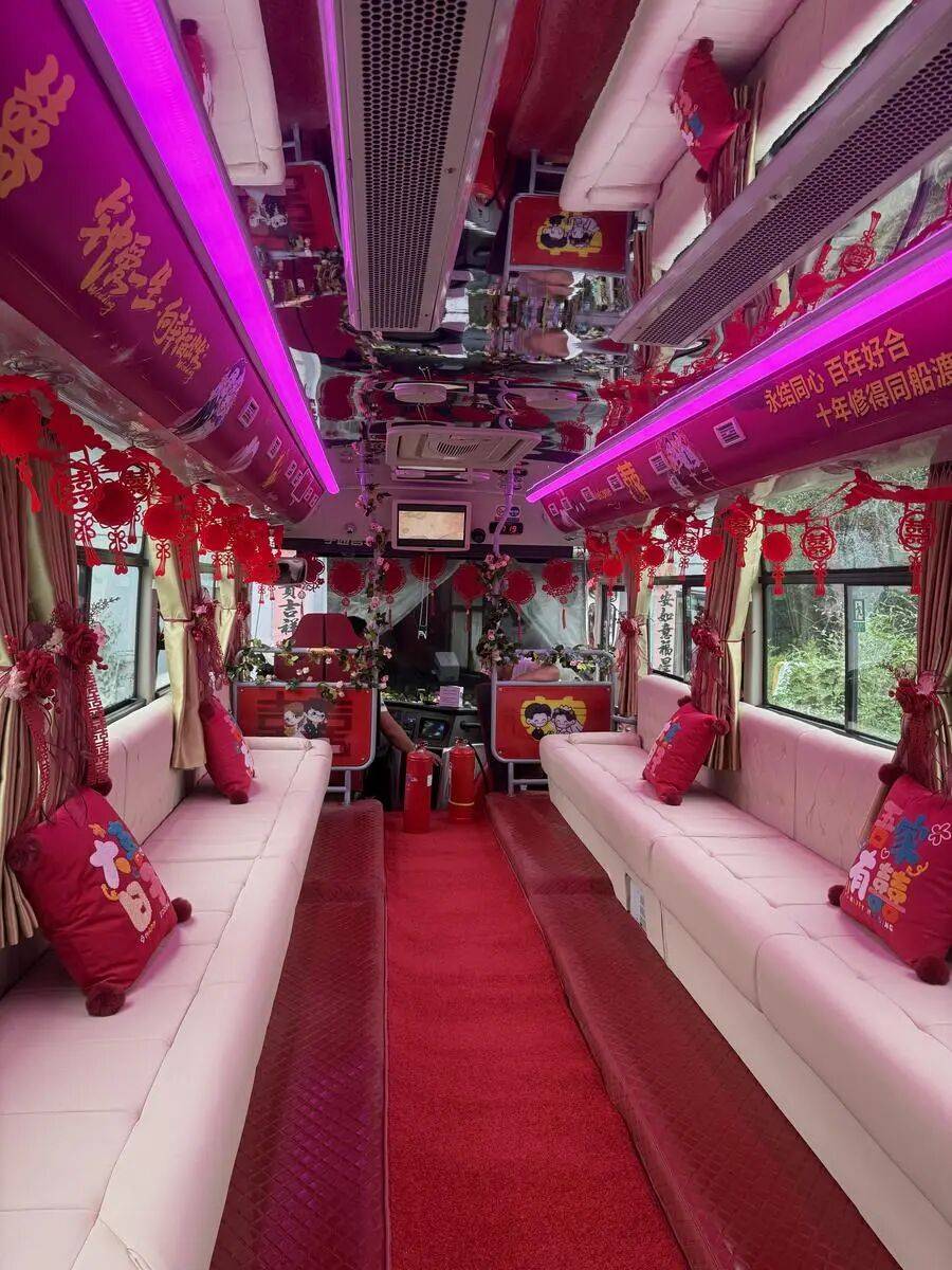 这辆新能源“大巴婚车”由张家口京西公共交通有限公司精心打造。车头以鲜花点缀,车身则用“我们结婚啦”的标语进行渲染,车内卡座被布置成“移动婚庆厅”,还贴有“百年好合”“永结同心”等祝福语,营造出浪漫而喜庆的氛围。这样的设计不仅让新人感受到了别样的婚礼体验,也让参与婚礼的亲友们感受到了浓厚的幸福气息。