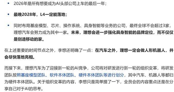 尽管未公布具体时间表与资源投入细节,但李想设定了明确目标:未来3-5年内成为具身智能领域标杆企业。这一转型标志着新能源汽车竞争从电动化向智能化深度跃迁,硬件载体与AI技术的融合程度将成为新赛点。随着理想汽车关闭低效门店、优化产能等调整措施同步推进,其技术落地节奏与市场反馈值得持续关注。