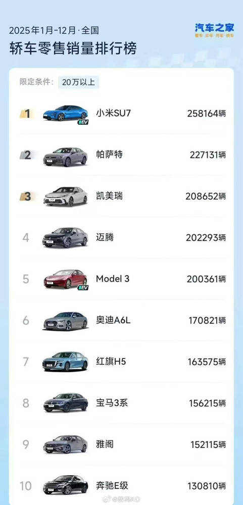 在最新公布的2025年国内20万元及以上轿车市场销量榜单中,小米汽车旗下首款车型SU7以绝对优势登顶年度销量冠军。这款新能源轿车全年累计零售销量达258164辆,不仅超越了传统燃油车领域的德系、日系劲旅,更在新能源赛道上展现出强劲竞争力。