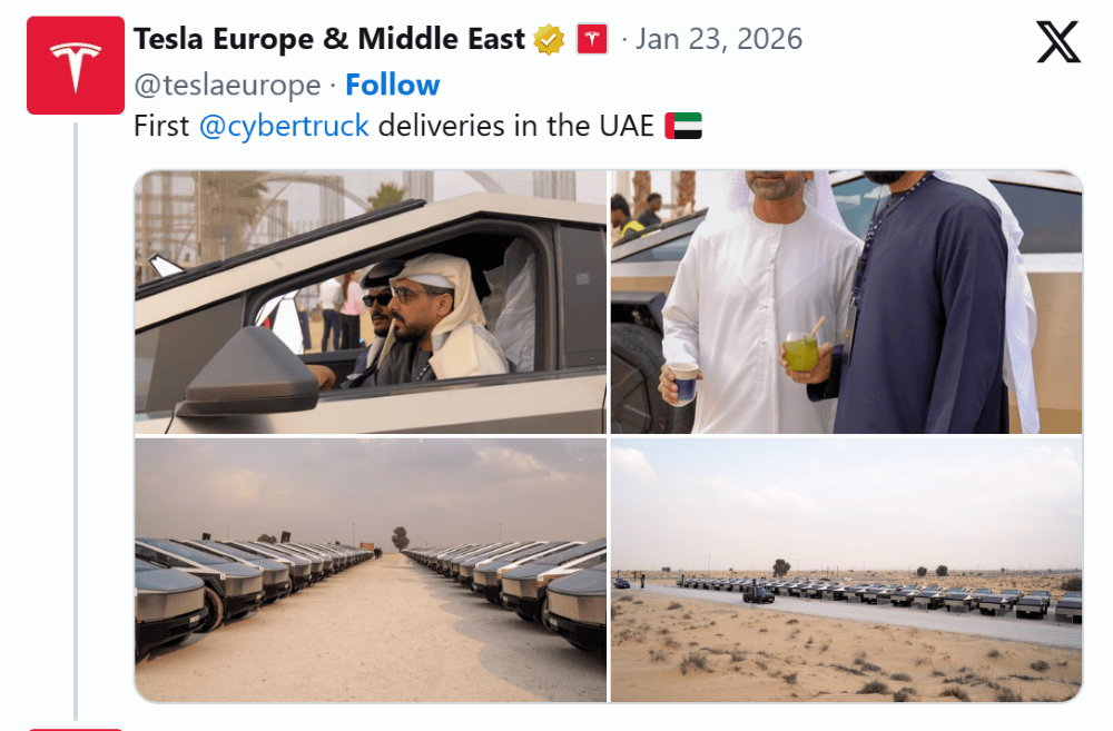 除了欧洲市场的深耕,特斯拉在中东地区也取得了重要进展。在阿拉伯联合酋长国,特斯拉完成了Cybertruck的首批交付,标志着这一车型正式进入中东市场。Cybertruck的交付在当地电动汽车用户群体中引发了强烈反响,进一步巩固了特斯拉在全球市场的地位。