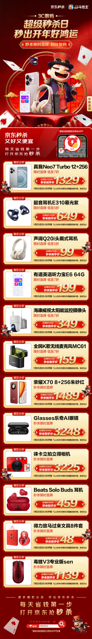 春节临近,正是焕新数码装备、入手心仪科技好礼的最佳时机。为满足用户对高品质数码产品的需求,1月25日晚8点,京东年货节盛大启幕,京东3C数码超级秒杀日同步开启,为消费者奉上一场科技感与性价比兼具的年终购物盛宴。活动期间,耳机、手机、学习机等多品类爆款好物低至5折,iPhone 17 Pro系列更可叠加多重优惠,直降千余元,助力轻松升级新年装备。