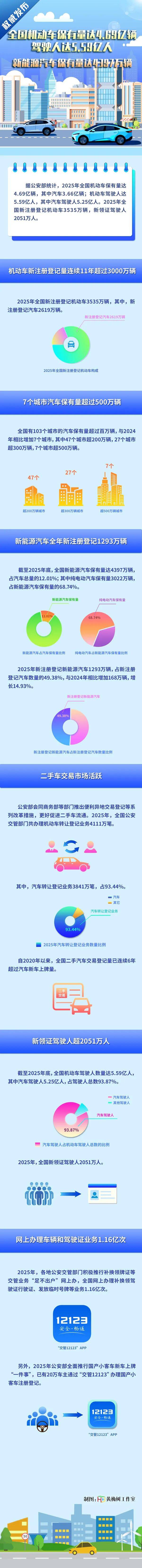 公安部最新统计数据显示,2025年全国机动车保有量突破4.69亿辆大关,其中汽车保有量达3.66亿辆。驾驶人群体规模持续扩大,全国机动车驾驶人总数攀升至5.59亿人,汽车驾驶人占比超九成,达到5.25亿人。