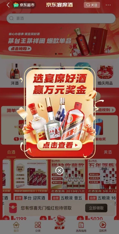 京东超市宴席酒负责人表示,现场“随份子”送祝福并不是临时起意,今年年货节也推出了“买宴席酒,可获得京东超市‘随份子’送祝福的抽奖活动”,最高金额可达万元。京东宴席酒不仅汇聚了茅台、五粮液等主流名酒,还与全国各地知名酒企业深度合作,独家开发了一系列的寓意美好、设计精美的宴席专属产品供消费者选择。京东宴席酒致力于通过丰富的选择、创新的服务和可靠的保障,让每一对新人的婚礼筹备更轻松、宴请更有面。