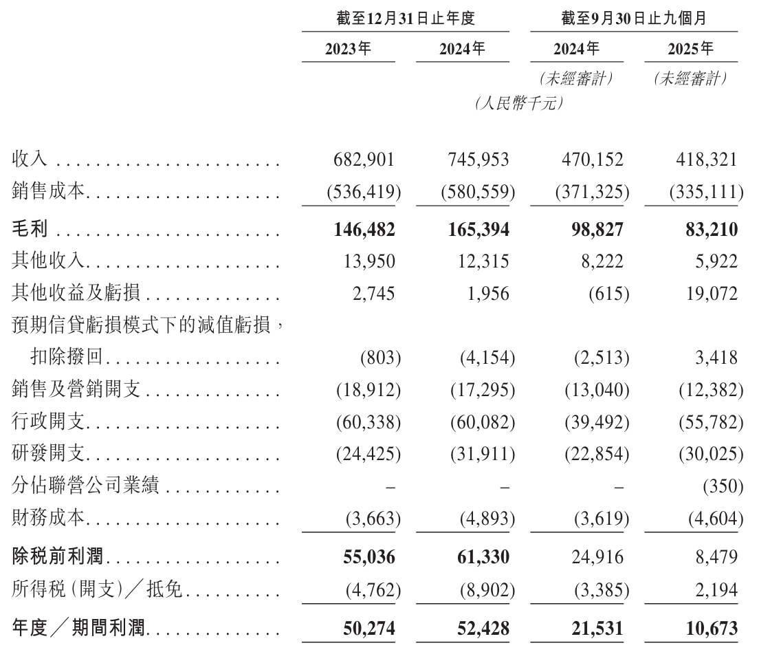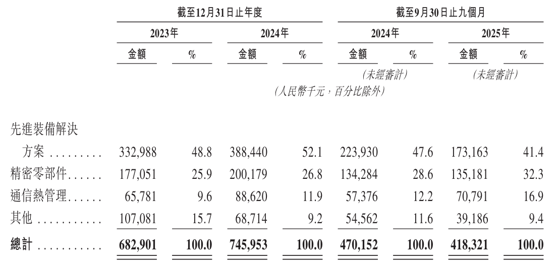 财务数据显示,精智实业近年保持稳健增长态势。2023年及2024年分别实现营业收入6.83亿元和7.46亿元,对应毛利为1.46亿元和1.65亿元,净利润则达到5027万元和5243万元。2025年前九个月,公司营收规模达4.18亿元,其中先进装备解决方案贡献1.73亿元(占比41.4%),精密零部件业务收入1.35亿元(占比32.3%),通信热管理业务实现7079万元收入(占比16.9%),其他业务收入3919万元(占比9.4%)。同期毛利为8321万元,净利润录得1067万元。