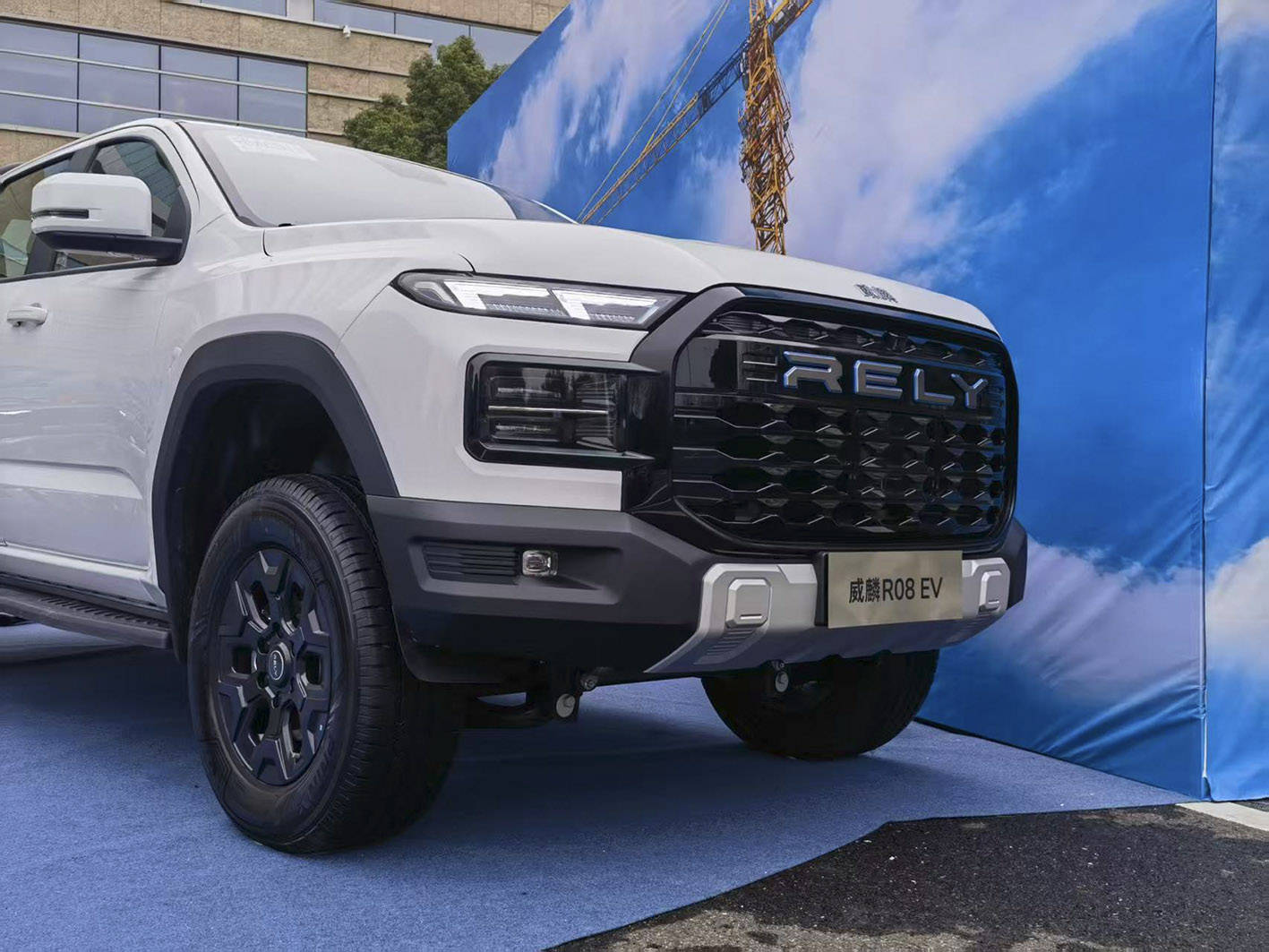 在外观设计上,威麟R08 EV延续了家族标志性的“麒麟力量美学”理念。前脸采用鳞甲造型的超大尺寸进气格栅,搭配分体式“麒麟瞳”LED大灯组,形成极具辨识度的视觉效果。与传统新能源车型不同,新车未采用封闭式前脸设计,而是在RELY英文标识处运用蓝色镀铬装饰,既保持了品牌特征,又凸显新能源身份。车身侧面通过265mm宽胎与高离地间隙设计,强化了越野气质。