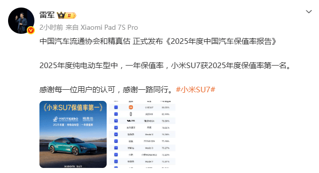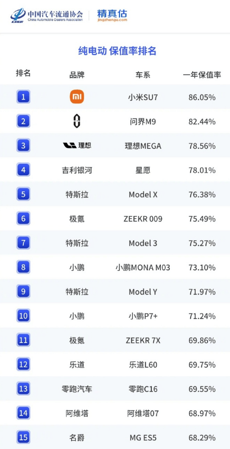 中国汽车流通协会联合精真估最新发布的《2025年度中国汽车保值率报告》显示,在纯电动车型一年保值率榜单中,小米SU7以显著优势登顶榜首,问界M9与理想MEGA分列第二、第三位。