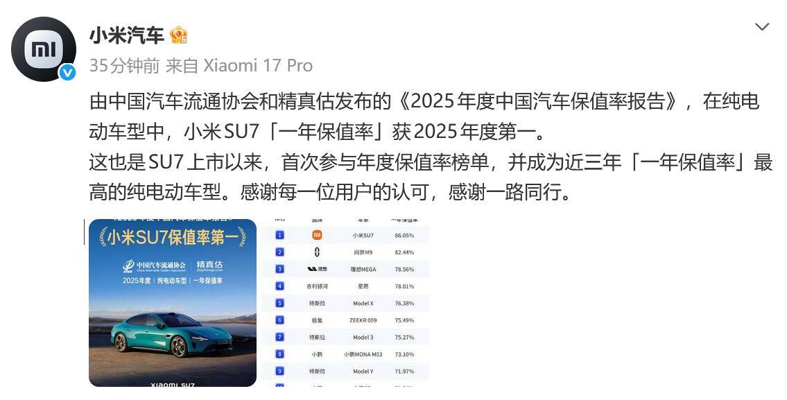 近日,中国汽车流通协会与精真估联合发布的《2025年度中国汽车保值率报告》引发行业关注。在纯电动车型细分领域,小米SU7凭借出色的市场表现,以「一年保值率」指标摘得2025年度桂冠。这一成绩不仅标志着该车型自上市以来首次跻身年度保值率榜单,更以近三年纯电动车型中的最高保值率刷新行业纪录。