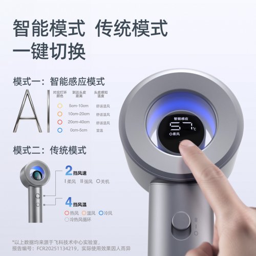 智能模式,传统模式,一键切换——飞科星环智能高速吹风机配备LED智能显示屏,支持一键触控切换两种吹发模式,轻松实现动态控温模式与传统模式自由切换。