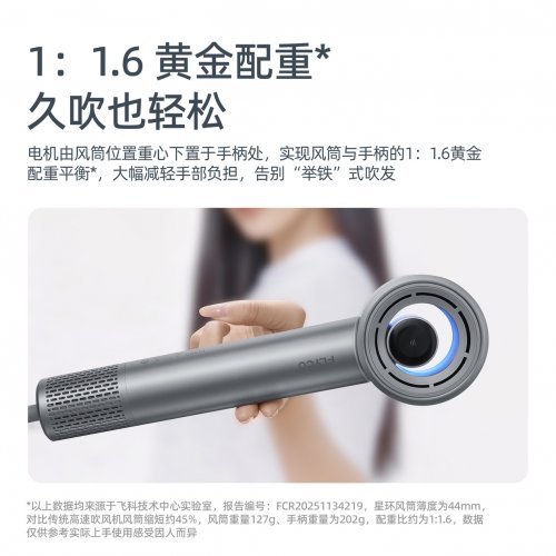 头轻,才是真的轻——为缓解长时间吹发手酸问题,星环重构内部空间关系,设计出符合人体工学的持握配重比,握感轻盈久吹不累手。飞科星环智能高速吹风机风筒缩短45%,重量轻至127g,业内领先的4.4cm超薄风筒设计便携易收纳,不占用额外空间。