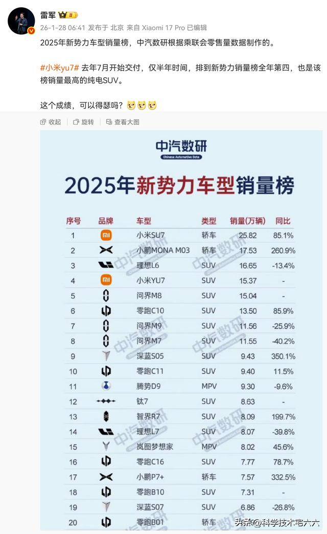 中汽数研近日发布的2025年新势力车型销量榜单显示,小米YU7以全年15.37万辆的成绩位列第四,成为纯电SUV细分市场销量冠军。这款去年6月底上市、7月开启交付的车型,仅用半年时间便跻身新势力销量前列,展现出强劲的市场竞争力。