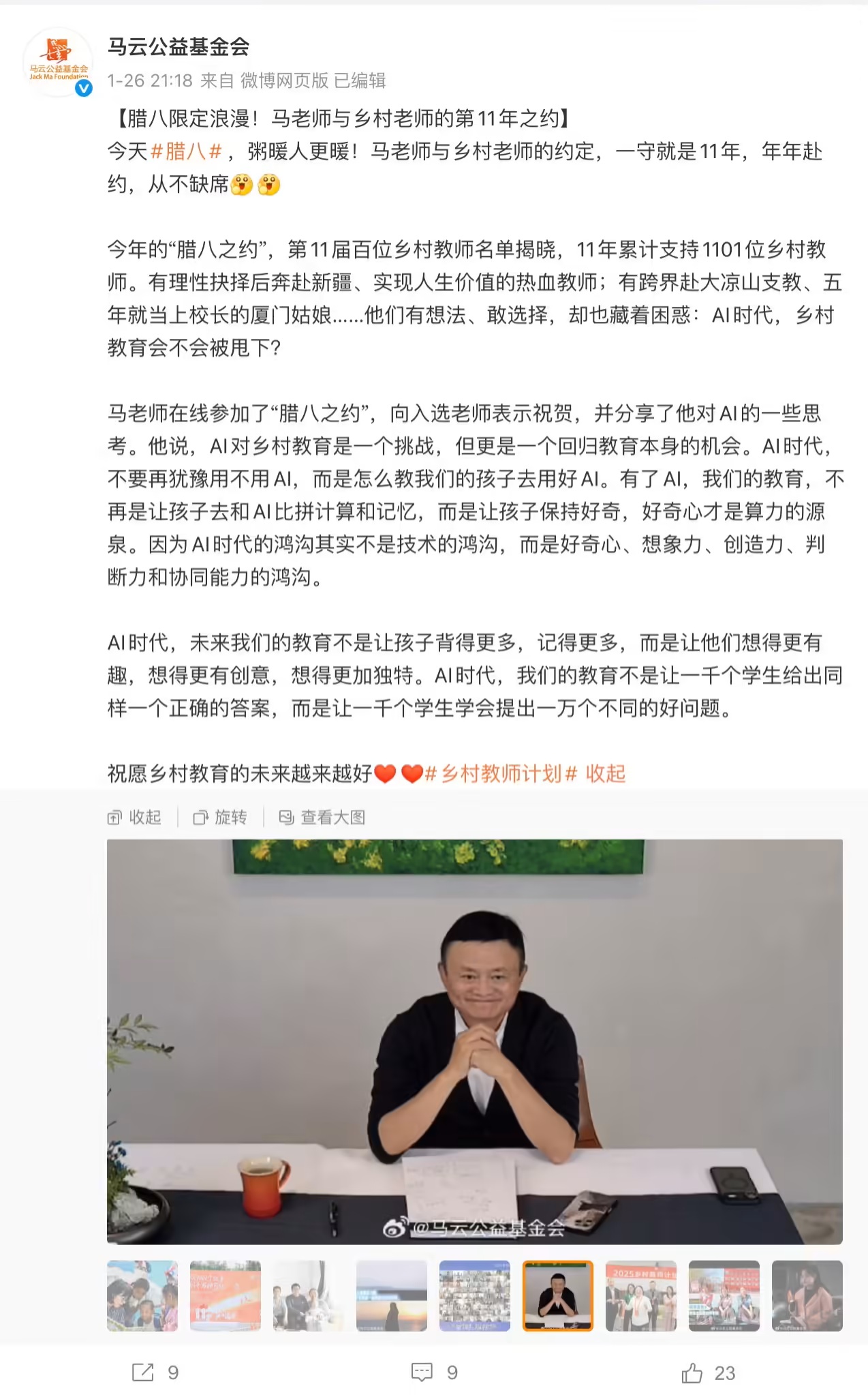 在近日一场以“腊八之约”为主题的活动中,马云公益基金会公众号对外披露了马云关于人工智能(AI)与教育融合的深度思考。这场活动引发了社会各界对AI时代教育方向的热议。