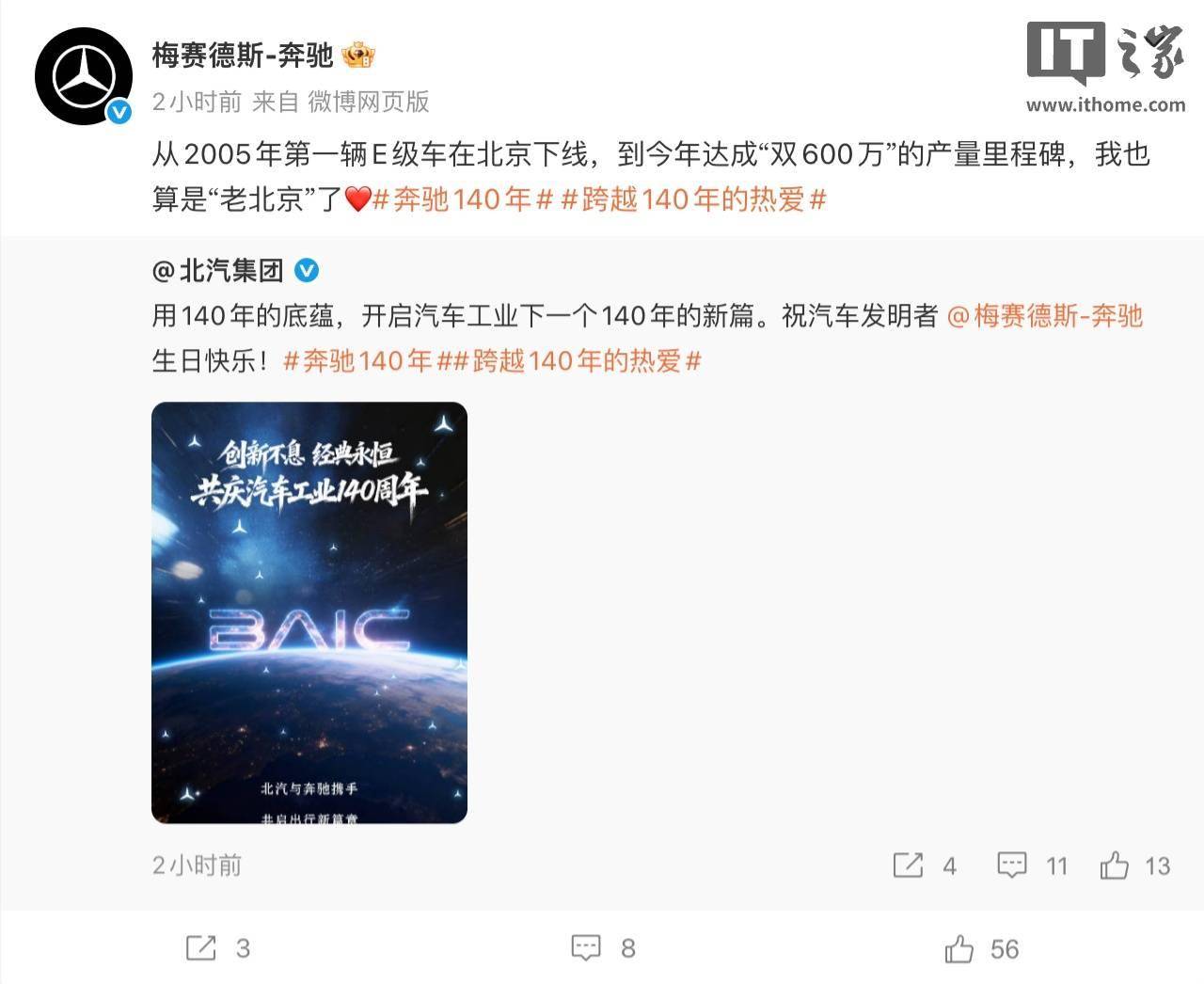 多家中外车企纷纷向梅赛德斯-奔驰送上生日祝福,以不同方式表达对这位行业先驱的敬意。北汽集团在贺词中提到:“用140年的底蕴,开启汽车工业下一个140年的新篇。”奔驰则幽默回应,称自己从2005年第一辆E级车在北京下线,到今年达成“双600万”产量里程碑,早已是“老北京”了。